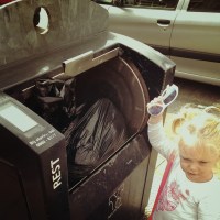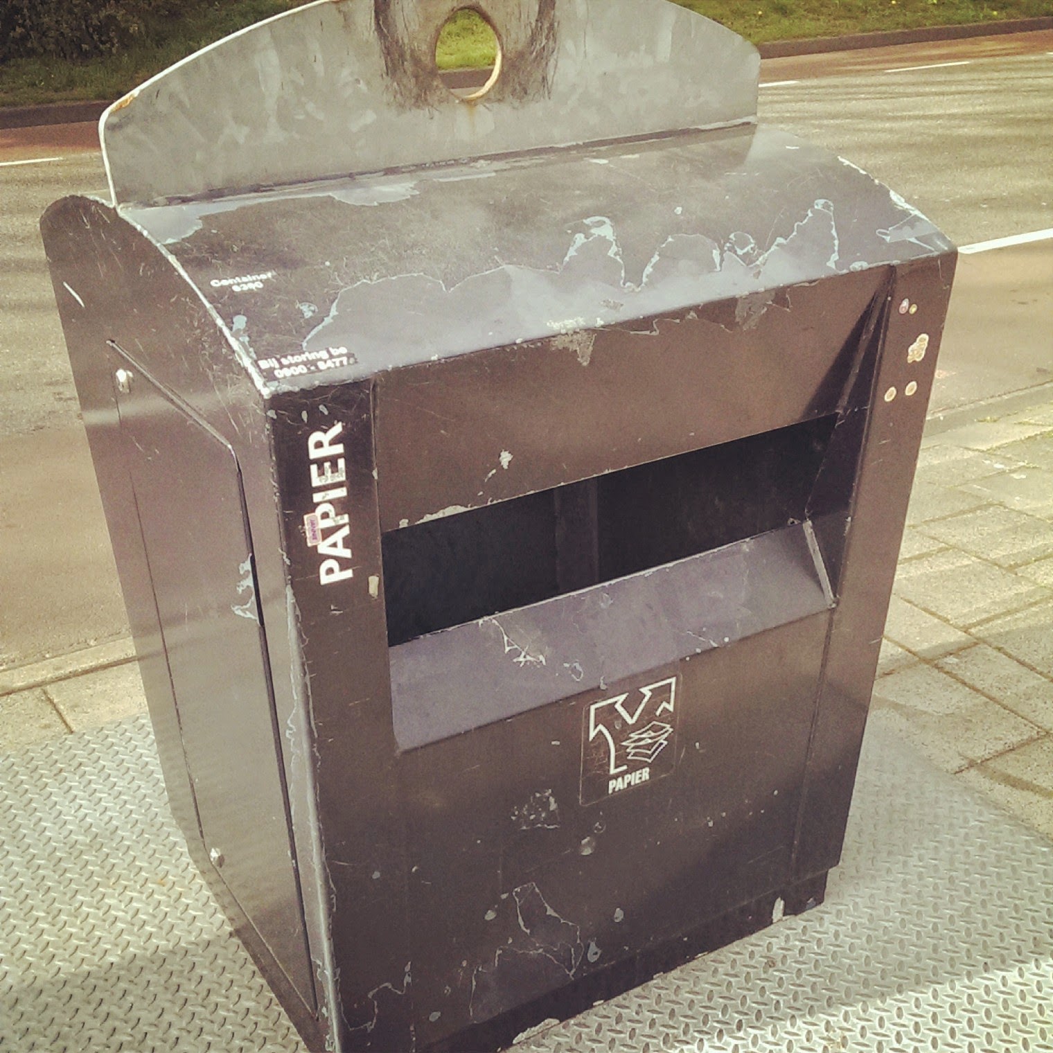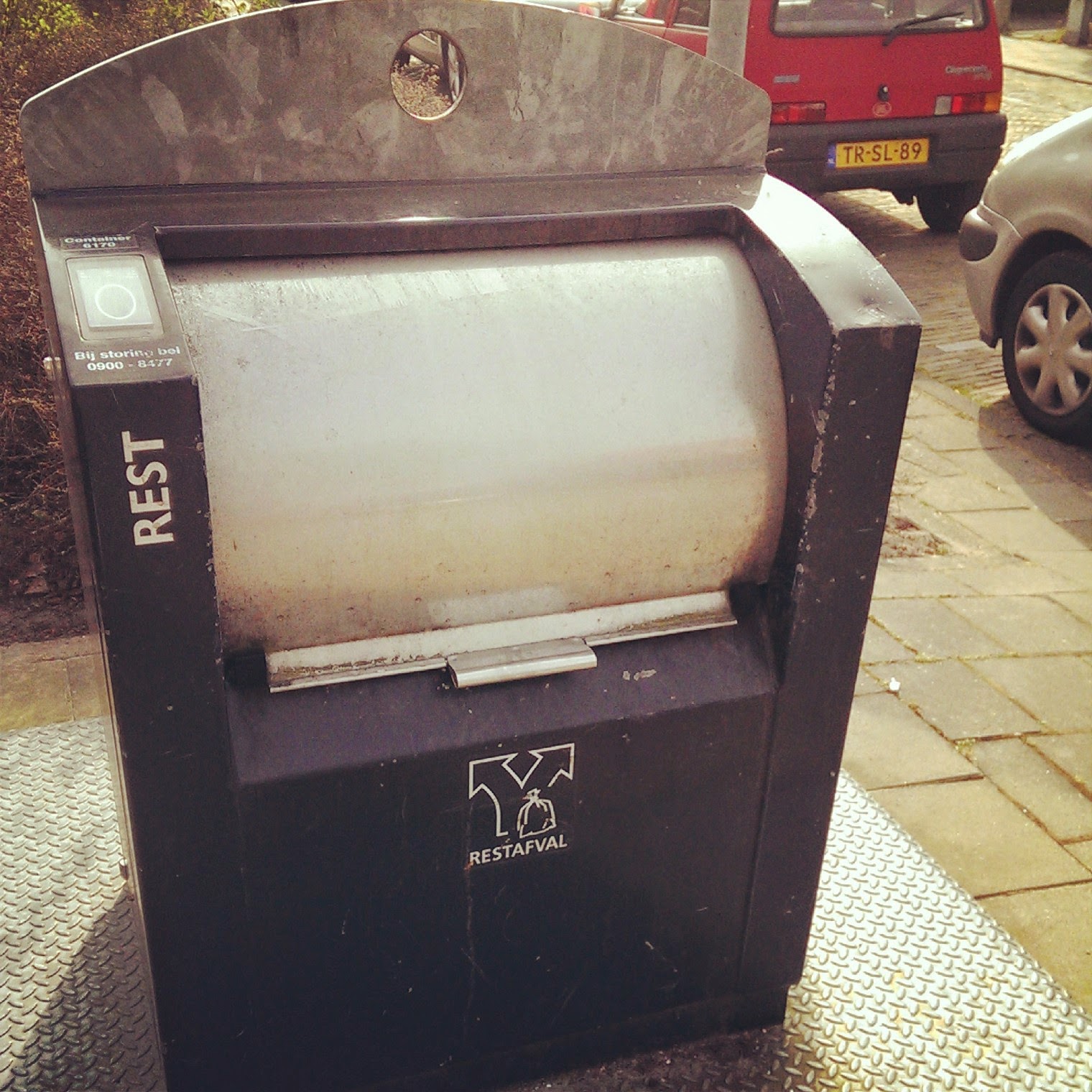 We don’t have big green bins here, we have underground bins that service the entire street (see below). You swipe your card, and dump your rubbish and once a week, a big truck comes and pulls the entire bin out and takes it away.