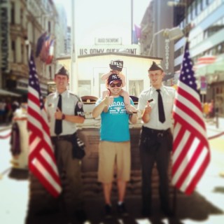 | Miss A and I at Checkpoint Charlie during a bike ride break |