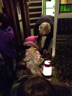 In the end, we brought her library bag (hidden in my handbag so we didn’t look greedy). Miss A was a bit hesitant at first, but once she worked it out, there was no stopping her. Her pockets were full after 3 houses!