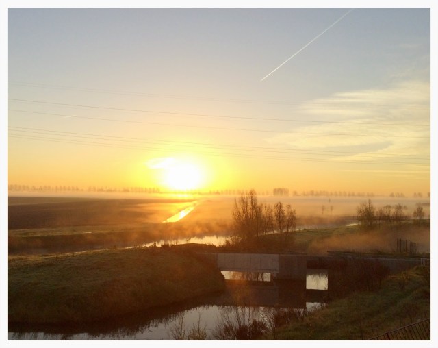 Well as it turned out I jumped on the bike Monday and it was not too bad at around 4-5 degrees. This morning however we got down to 0 degrees. Luckily the sun was shining so it was at least encouraging to be out in the cool air. To be honest once I was about 5 minutes into my run (well bike) I was pretty warm so the cold didn’t really bother me. The morning was again beautful with some light fog across the open farm land and the sun coming up over the top of it. So even with the cold it was a really spectacular day.