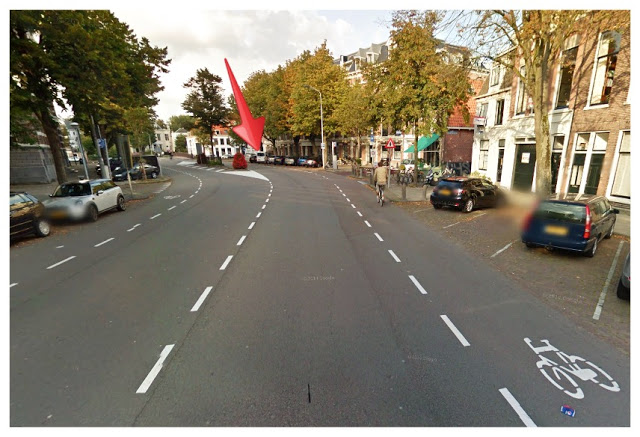 | Bike lane in Haarlem. The arrow marks the point where I got hit. |