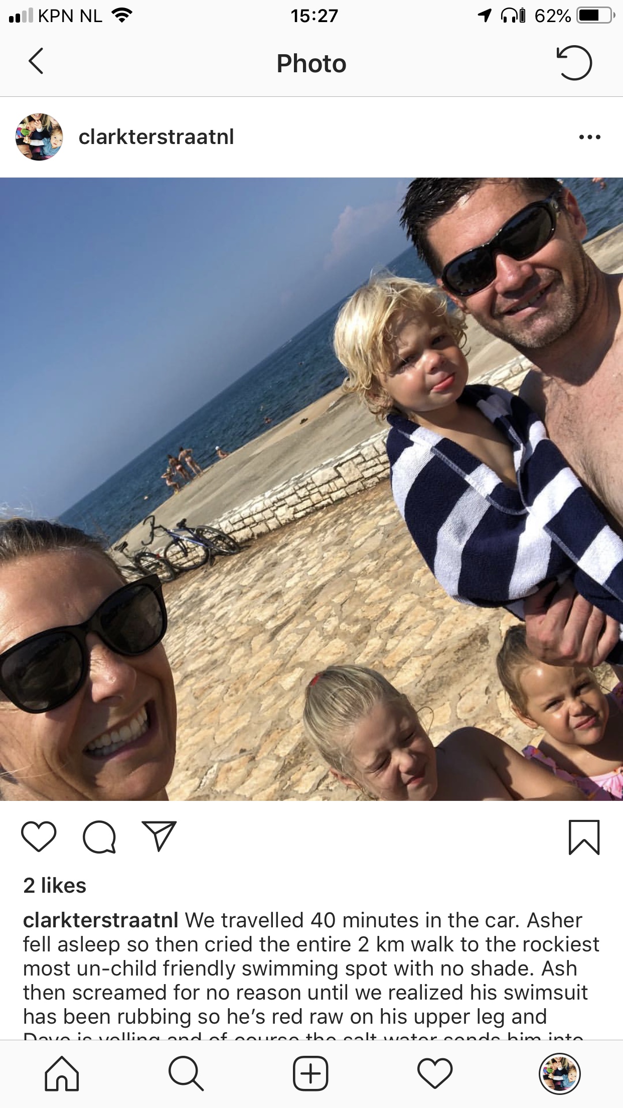 Umag, Croatia. This photo…. the last 15km of our journey took over 2 1/2 hours as we were stuck in horrendous traffic. The GPS took us on a hair raising detour that ended up shaving zero time off our journey (as we merged into traffic behind the same car we were behind 25 minutes earlier). The humourless Croatian border controller, who sighed when I told her I’d left the girls Dutch ID’s at home (apparently, you need these AS WELL as your passports). We arrived in 45 degree heat. Checked in, threw our swimmers on – no swimming nappies (cue fight between Mum and Dad). A somewhat challenging dinner with 3 tired kids. Dave took a howling Ash to bed and the girls and I went for a swim (after we navigated our way across 20 metres of rocks, each felt like a piece of lego under foot). Here’s our smiling Instagram photo….