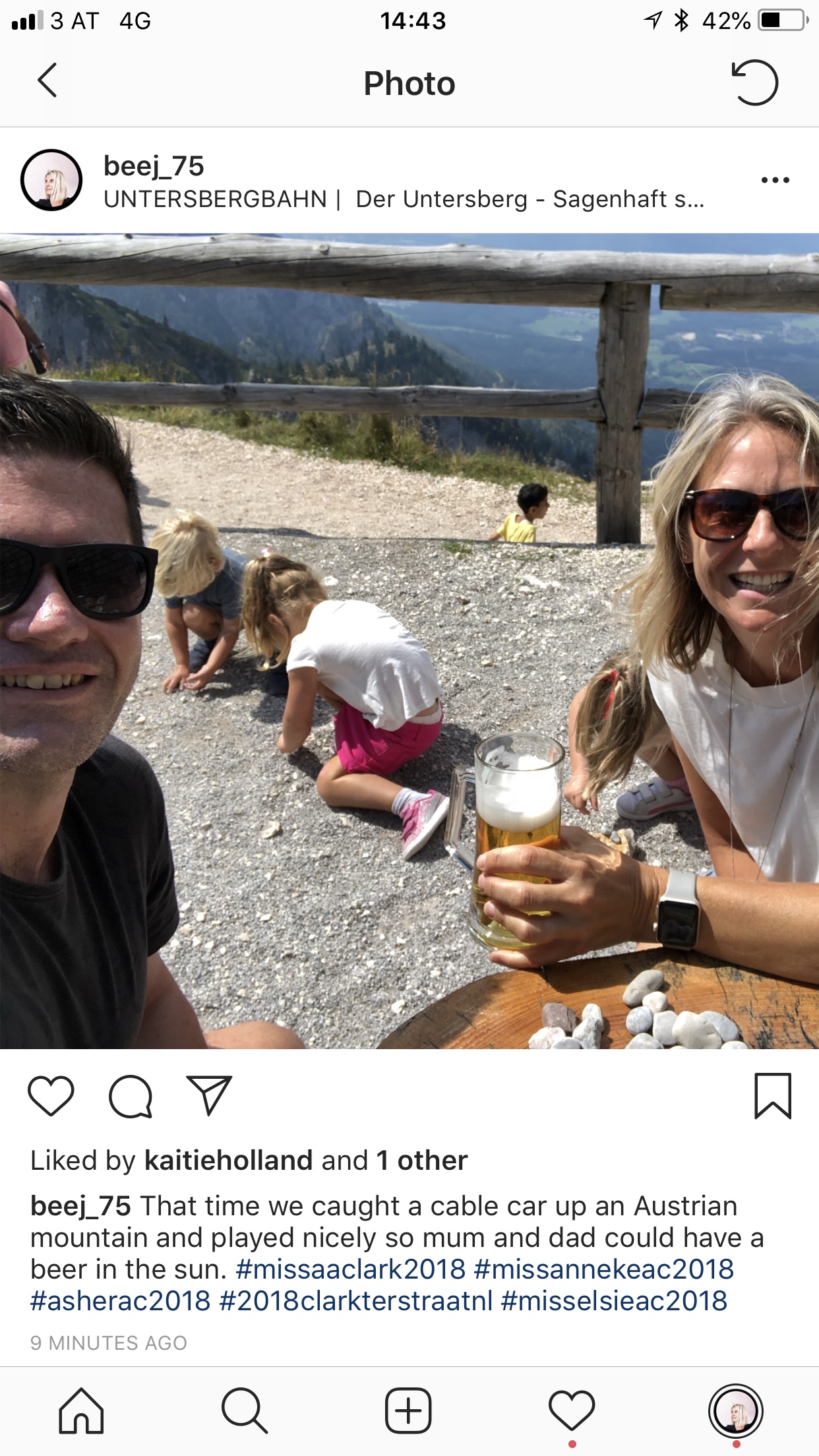 Untersbergbahn, Salzburg. I posted this after we caught a gondola up a mountain in Austria. We had been in the car for 3 hours, the kids were less than enthusiastic about the plans for the day, Elsie practically had a melt down on the gondola, once at the top – I remembered I’m scared of heights, I spent the entire time screaming at the children to move away from the edge. We decided that an icy pole might help. We bought the wrong icy pole, so Dave trekked halfway down the hill to get another icy pole, which Asher then dropped and of course cried. All of a sudden the stars aligned, the beer arrived and we managed ONE nice snap of the family.